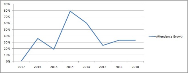 Attendance growth has been declining since after 2014 – the year after the Sydney Harbour Bridge was introduced into the event – and by this trend, should mean future editions of the event would have smaller crowds than in previous editions which has never happened before. This is because next year could see Vivid entering negative growth for the 1st time.