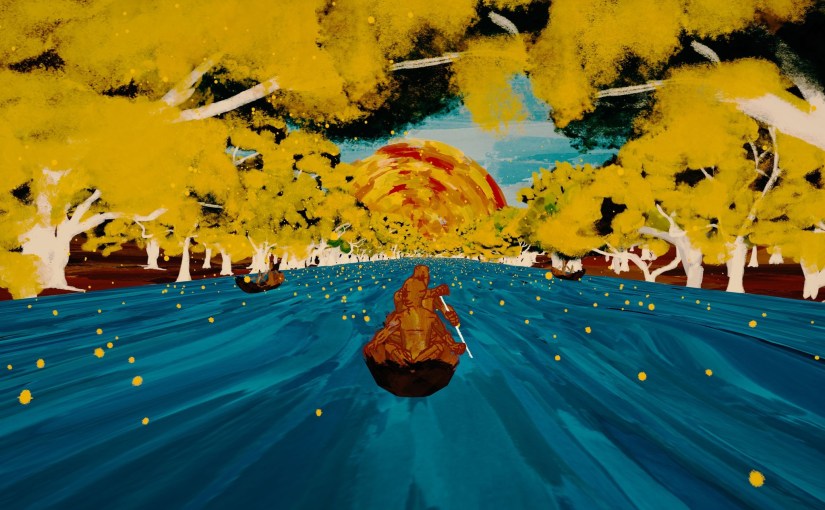 “The further we travel down the river, the more we see the environment changing – the trees & stars are replaced by buildings & lights from the city. The young boy is no longer in a traditional canoe, he is in a dinghy & fishing with a rod rather than a spear”