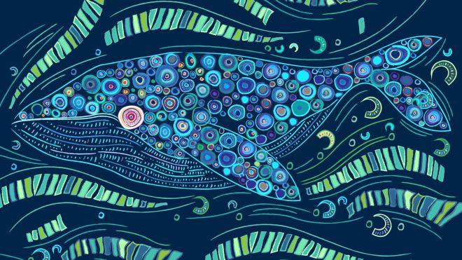 “Our Calling Country features the song of the whale as we call the clans. The call and response is heard as the smoking commences and our warrior arrives carrying the message stick as the women begin the cleansing.