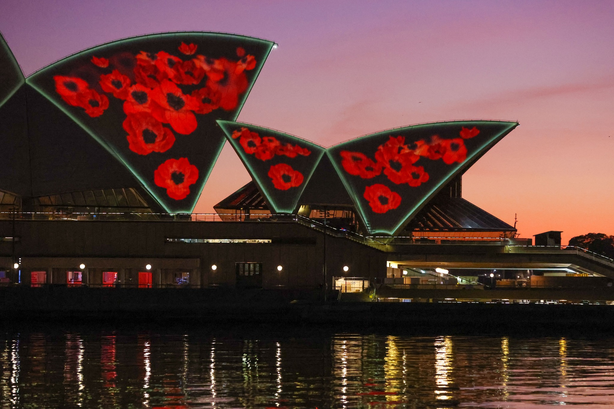 At Friday dawn, the Sydney Opera House was lit up with projections of poppies as a service was held across the Harbour at the Overseas Passenger Terminal to commemorate the fallen of the 1st World War.