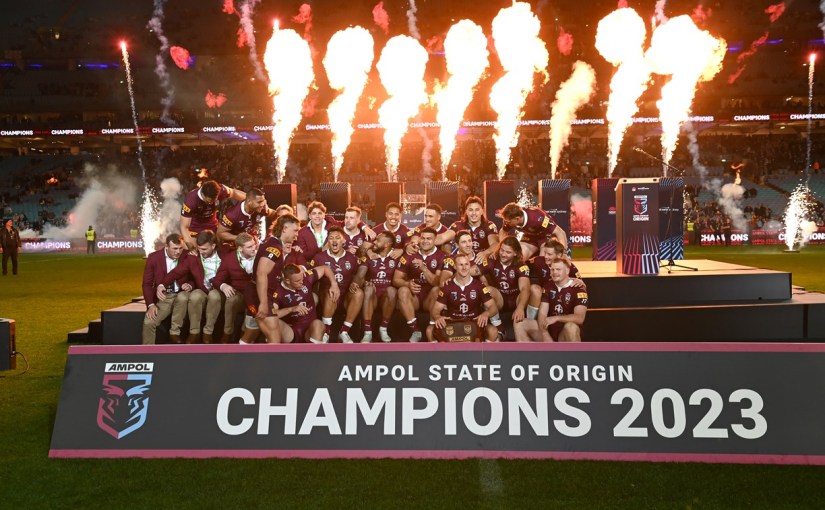 Wally Lewis, Andrew Abdo & Brent Merrick then presented the State Of Origin Shield to Daly Cherry-Evans, who immediately lifted it up to the cheers of the crowd as flamethrowers lit up the stage. The former three people moved out the way for the rest of the Queensland team and staff who gathered around the Shield as Queen‘s iconic song, We Are The Champions, played. Ground fireworks exploded behind the stage as Queensland cheered in victorious glory while their families joined them on stage. That was State Of Origin 2023.