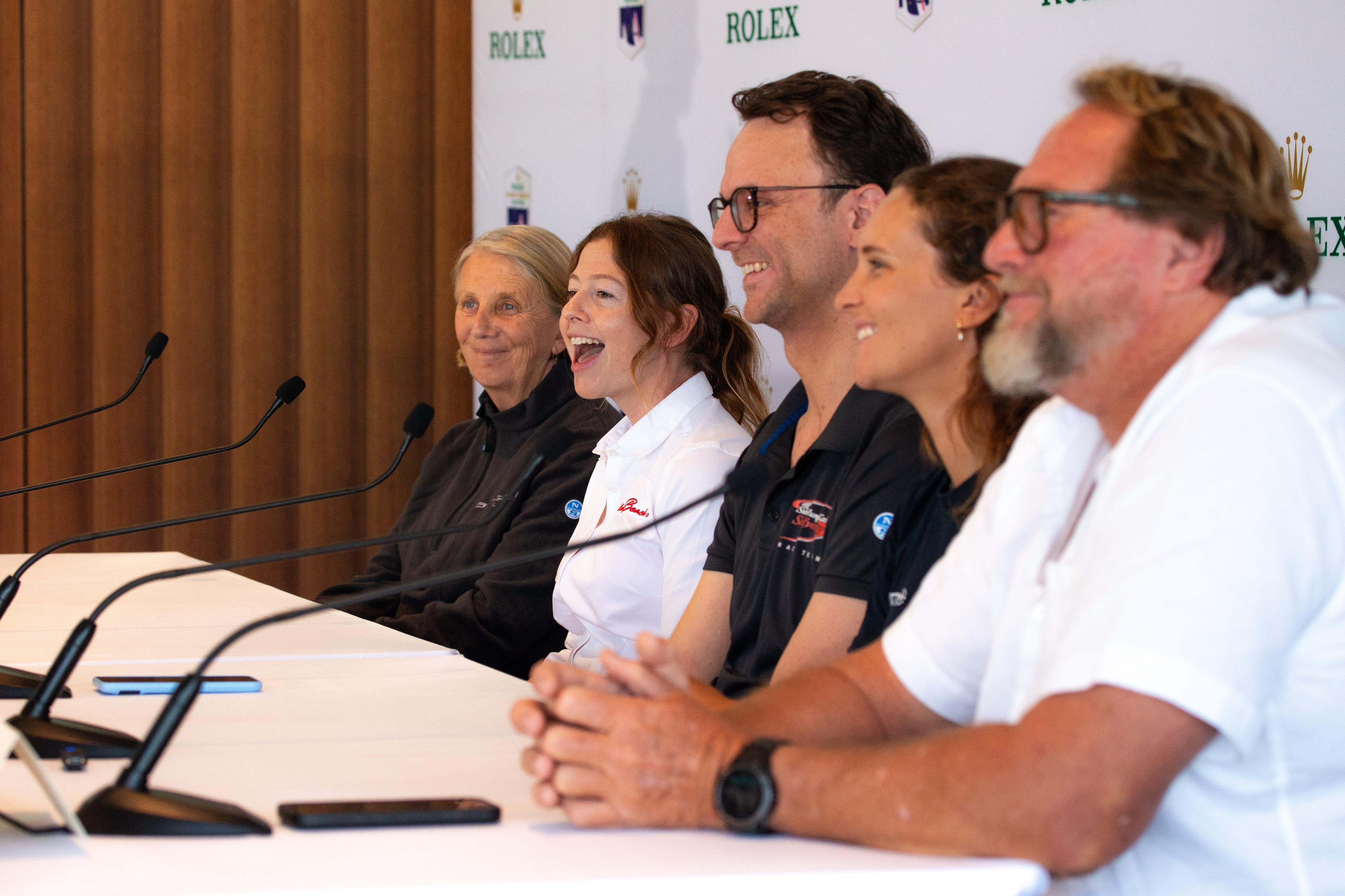 Alice Tarnawski answering questions at the Long-Range Weather Forecast Press Conference with, from left to right, Adrienne Cahalan, Chris Wild, Clare Costanzo & David Turton. Photograph: Ashley Dart/Cruising Yacht Club Of Australia