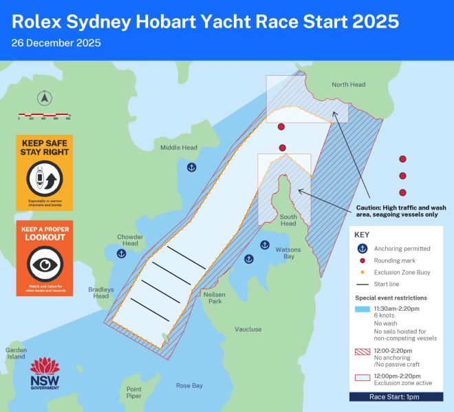 The official Sydney-Hobart Yacht Race 2025 spectator boating map Image: NSW Government