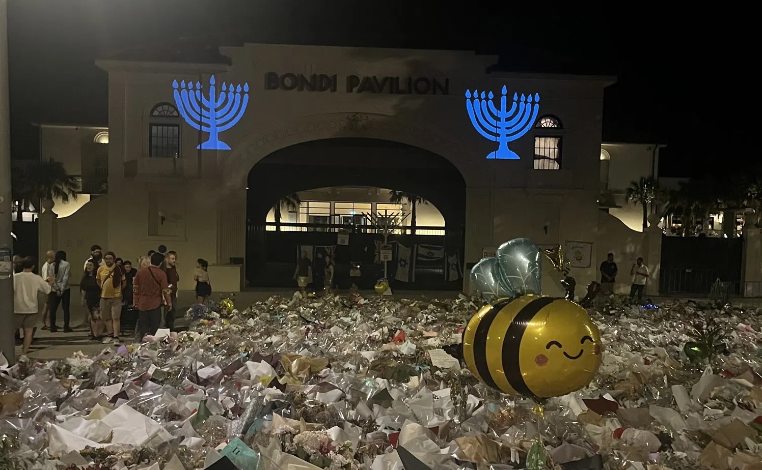 In the background of a massive temporary floral tribute, Bondi Pavilion was illuminated with surprise projections of 2 blue Chanukiahs as beams of light shone to the sky above it from the courtyard within the Pavilion.