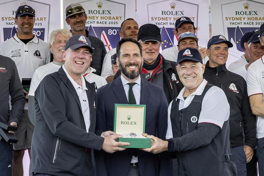 An informal trophy giving ceremony was held at the Hobart Race Village when Comanche docked, where they were given the John H Illingworth Challenge Cup & a Rolex timepiece.