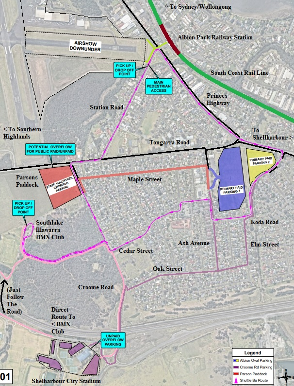 Shuttle Bus/Car Park Arrangements (With Additions by Sydney Spectaculars) Light Green: Walk from train to event; Black: Main driving routes; Purple: Quickest Drive from Albion Oval to Shellharbour City Stadium; Red Lines: Quickest Drive from Albion Oval to Parsons Paddock; Light Pink: Walks from Shellharbour City Stadium to Shuttle Bus (Including Via Cedar Street/Croome Road Intersection). Original Traffic Management Plan: Airshows Downunder Shellharbour/Altus Group