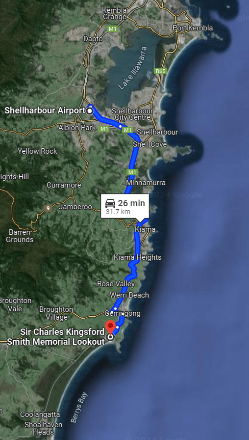 Shellharbour Airport to Sir Charles Kingsford Smith Memorial Lookout Drive Image: Google Maps