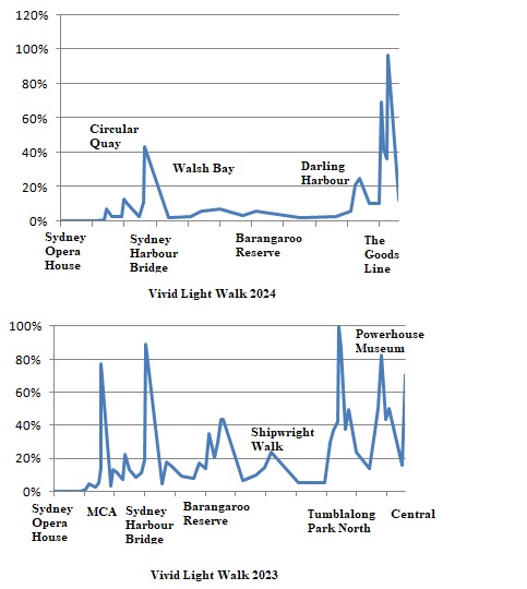 As you can see 2023’s line is notably higher & fluctuating more than 2024’s line, this signals an entertaining Light Walk with something new always around the corner, particularly at the Museum Of Contemporary Art, the Sydney Harbour Bridge south-eastern pylon, Tumblalong Park, the Powerhouse Museum & Central Railway Station. Whilst Barangaroo Reserve was a significant rise in attention-grabbing, the line notably dips at the Barangaroo development just south of the Reserve & around the western and eastern shores of Cockle Bay in Darling Harbour – the only parts deemed not entertaining, though Cockle Bay’s dip is due to the best vantage point for the Bay’s water light show being on the southern shore.