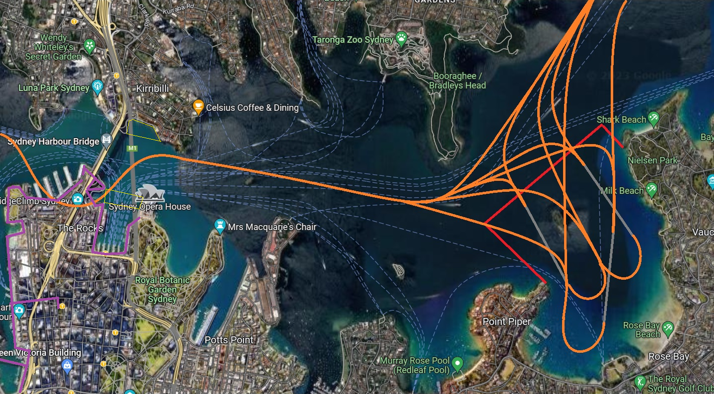 Orange: Approved Seaplane/Helicopter Air Routes, Red: Rose Bay Water Airport Boundary, Silver: Recommended Seaplane ‘Runways’, Yellow: Vivid Sydney Drone Show Boundaries, Purple: Vivid Light Walk 2023