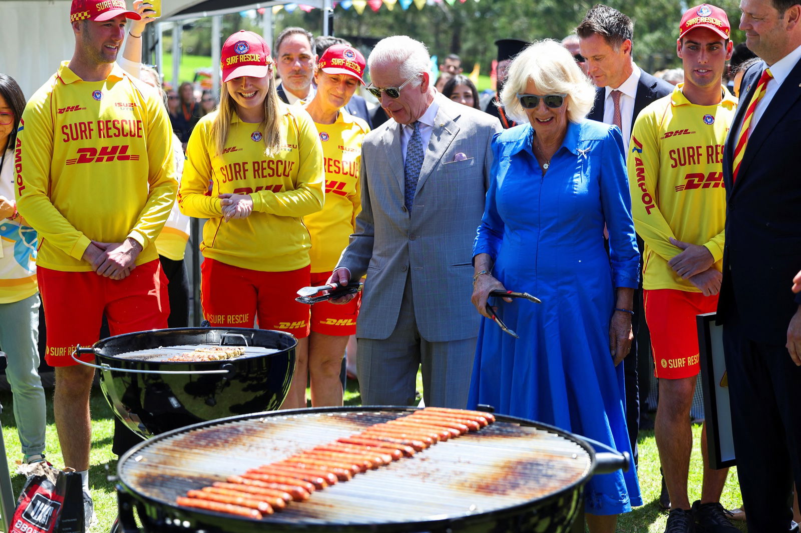 At 1:05pm, at Parramatta Park, the King & Queen were reunited at the Western Sydney Community Barbeque, where they were welcomed by their host, the Premier & Deputy Premier of New South Wales, Chris Minns & Prue Car respectively. King Charles participated in another smoking ceremony, this time with Queen Camilla. They were greeted by 500 guests of the region’s diverse community include community leaders and organisations, volunteers & individuals who have excelled in their field with some children giving King Charles & Queen Camilla flower crowns, one of which the Queen tried on, before they both had a go at barbecuing after meeting surf lifesavers.