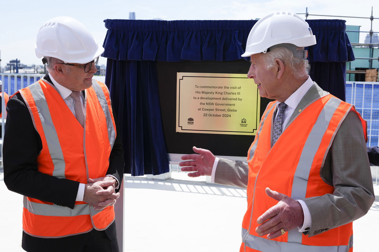 At 11:55am, King Charles left the National Centre For Indigenous Excellence in Redfern & by car, headed to & arrived at the Homes New South Wales (NSW) project in Glebe on Cowper Street. He was greeted on arrival by the NSW Premier, Chris Minns who introduced him to the Australian Prime Minister, Anthony Albanese. They talked about sustainable housing. 15 minutes later, The King & all dignitaries then donned hi-visibility vests & hard hats for a tour of the construction site, escorted by the NSW Premier& met construction apprentices and beneficiaries of social housing projects from neighbouring communities as well as Julie Bishop, King’s Trust chairperson, who is funding the Homes New South Wales (NSW) project in Glebe, which King Charles then unveiled a plaque at.