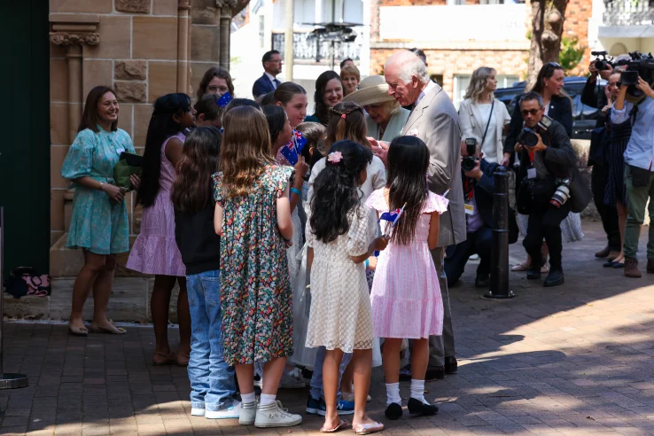 At 10:25am, King Charles & Queen Camilla arrived at Saint Thomas’ Anglican Church in North Sydney to a cheering crowd of hundreds waving the Australian National Flag & Union Jacks. They met children from a local Sunday school, who they shook hands with & where King Charles was presented with a rugby ball, cricket ball & stuffed koala, for his grandchildren Princes George and Louis & Princess Charlotte.