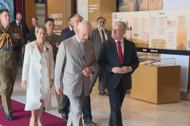 At 11:50am, King Charles arrived at the New South Wales Parliament House, where a crowd of several hundred had gathered outside. The King was met by NSW Governor, Margaret Beazley, the Legislative Council President, Ben Franklin, the Legislative Assembly Speaker, Greg Piper, the Usher of the Black Rod, Jenelle Moore & another parliamentary official. They walked down a red carpet to the stairs they take them inside to the reception celebrating the Legislative Council’s bicentenary.