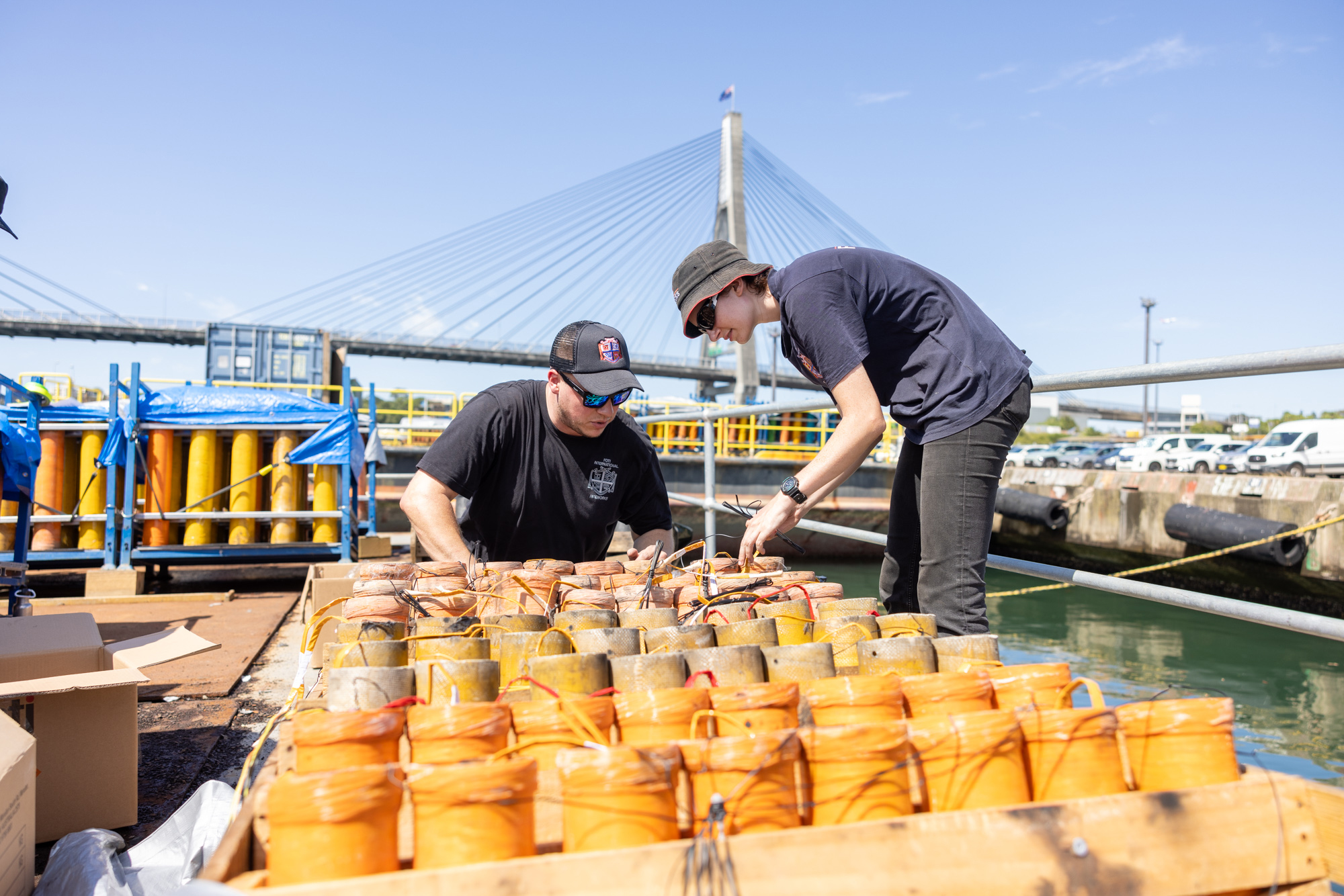 Since the 20th of December, Foti International Fireworks have unpacked 120 tonnes of equipment from 18 shipping containers to link over 80 kilometres of wires & cables to 16 computers & 32 firing panels.
