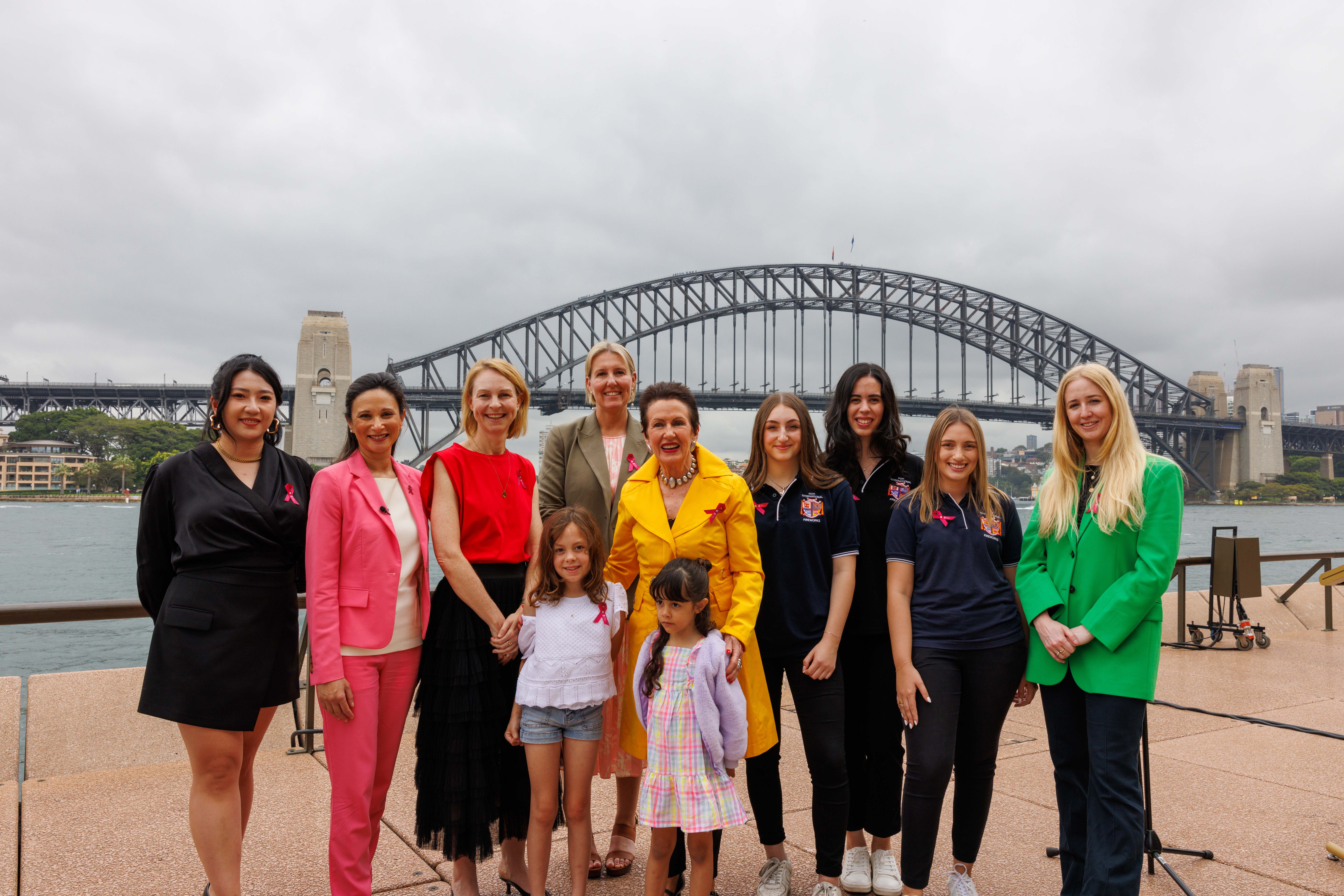From left to right: Luna Pan, Associate Professor Cleola Anderiesz (National Breast Cancer Foundation Chief Executive Officer), Kath Earle (ABC Arts, Music & Events Head), Olivia Webster, Emma Rigney (City Of Sydney Life Executive Director) Lord Mayor Clover Moore, Calula Webster, Nicolette Anastasio, Elena Colosi, Georgia Rapisarda, Alice Robinson (VANDAL) Photograph: Pheobe Pratt/Sydney New Year’s Eve
